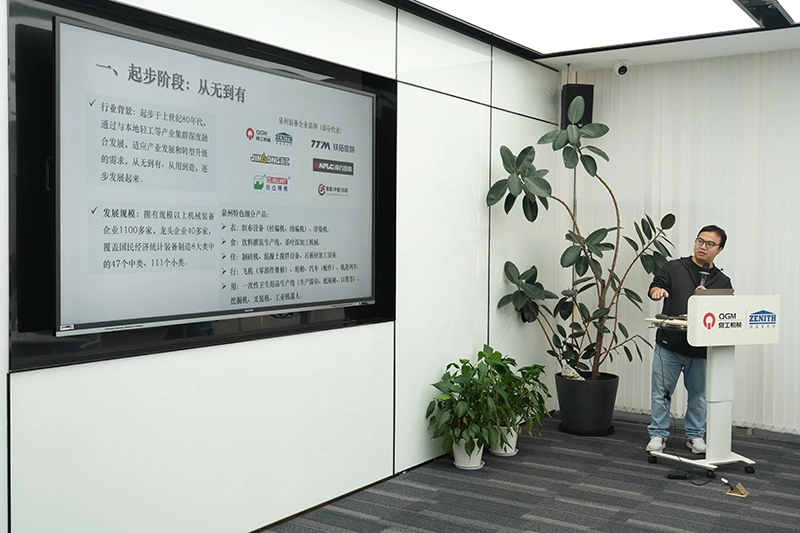 Di ruang konferensi, staf dari Bagian Peralatan Biro Industri dan Teknologi Informasi Kota Quanzhou menjelaskan situasi dasar, sejarah perkembangan, dan prospek masa depan industri manufaktur peralatan Quanzhou; video promosi Quanzhou Machinery Industry Co., Ltd. juga ditampilkan.